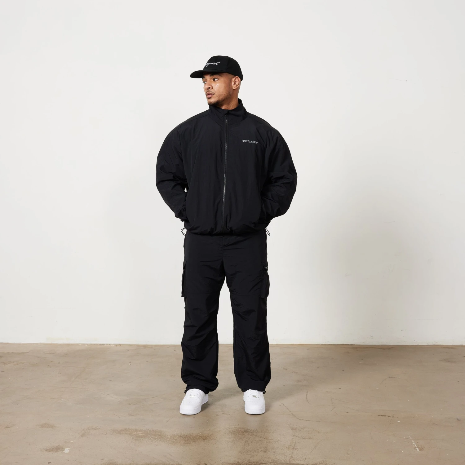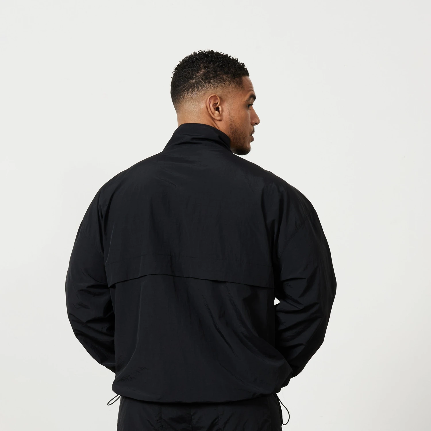 This brand new style of track jacket comes in an oversized fit on the sleeves and body with drop shoulder seams and a high neck collar with full length zip. Finished with elastic at the hem and cuffs with adjustable bungee cord and front pockets. This piece is made from 100% Nylon and features a reflective style of branding on the front.