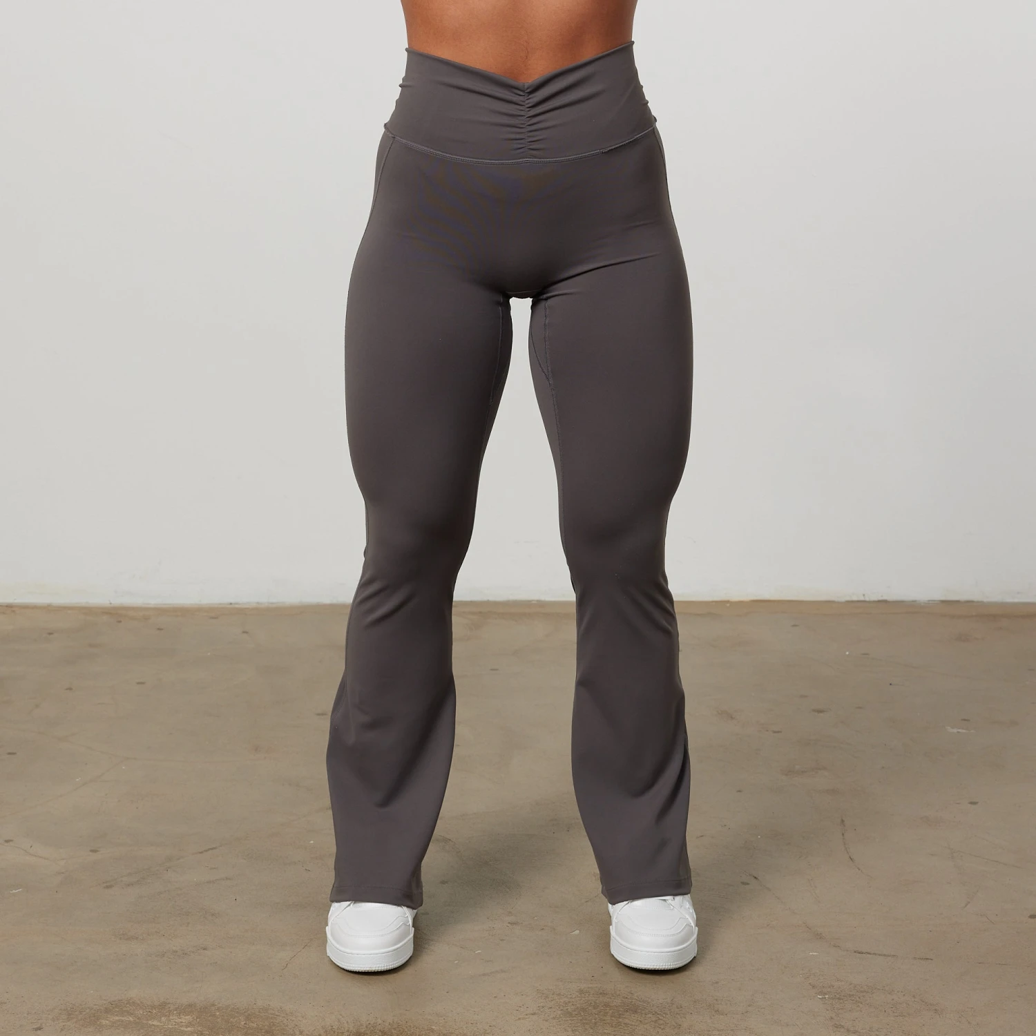 These leggings, made in our softest cut & sew fabric yet feature a flared leg opening, a crossover ruched waist band, flattering panel detail at the back and Vanquish branding on the back waist.