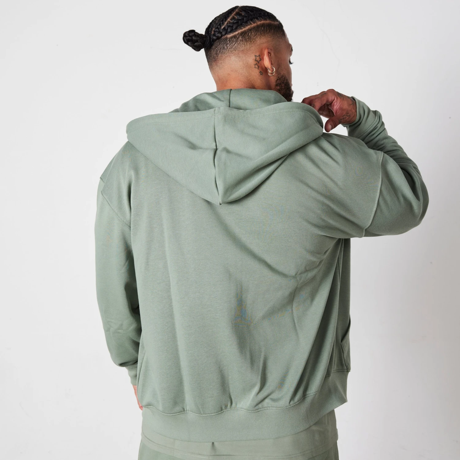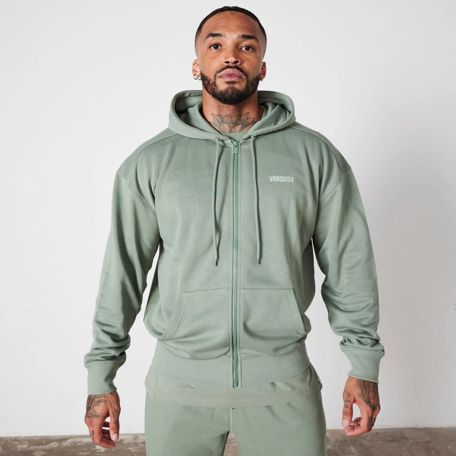This brand new style of full zip hoodie comes in an oversized fit with relaxed forward shoulder seams and a front kangaroo pocket. Featuring a minimal tonal Vanquish logo on the left chest with deep ribbed cuffs and waistband.