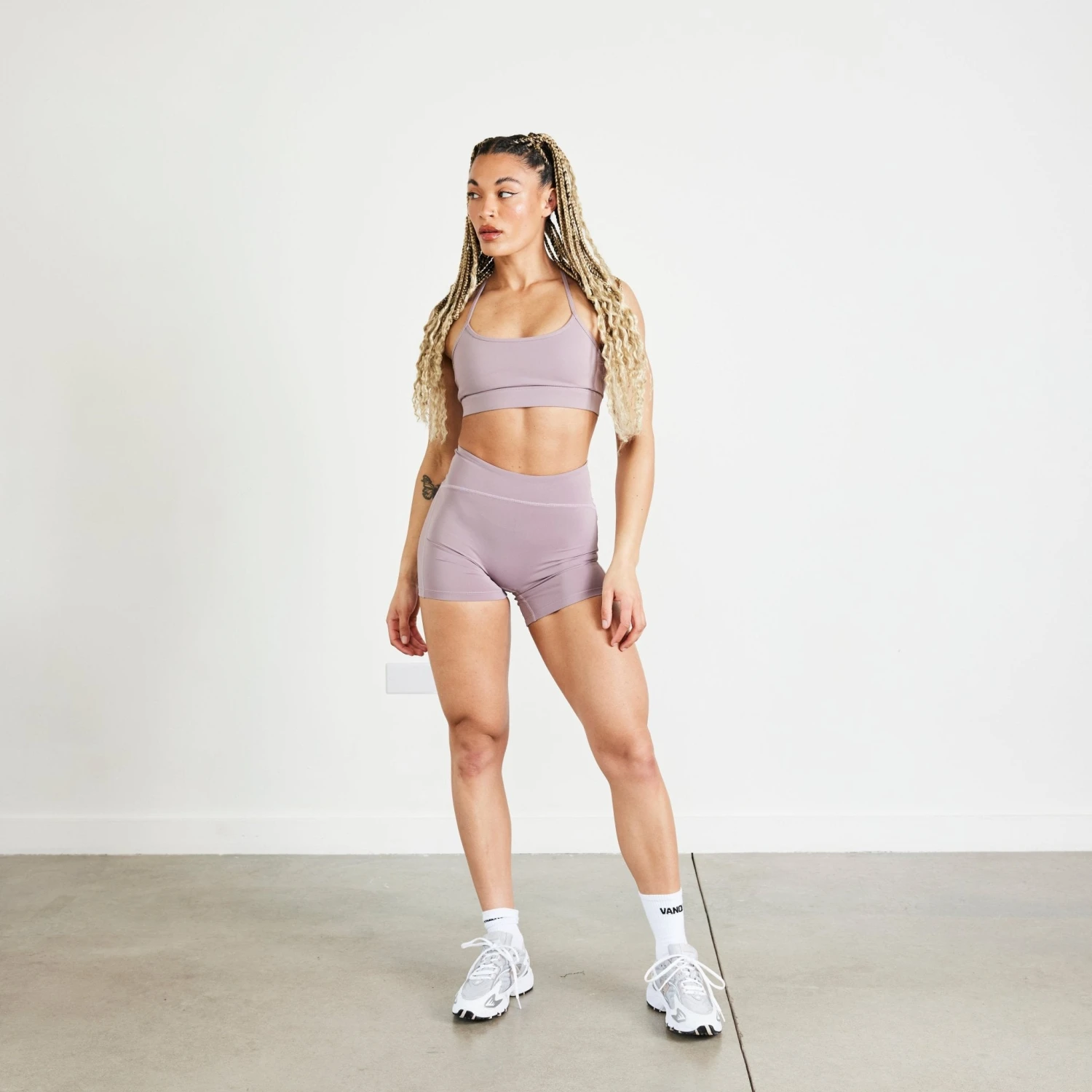 This low support bra, made in our buttery soft cut & sew fabric features a low scooped neckline and removable padding. The back features minimal, thin straps with contouring seams and tonal Vanquish branding on the back waistband.