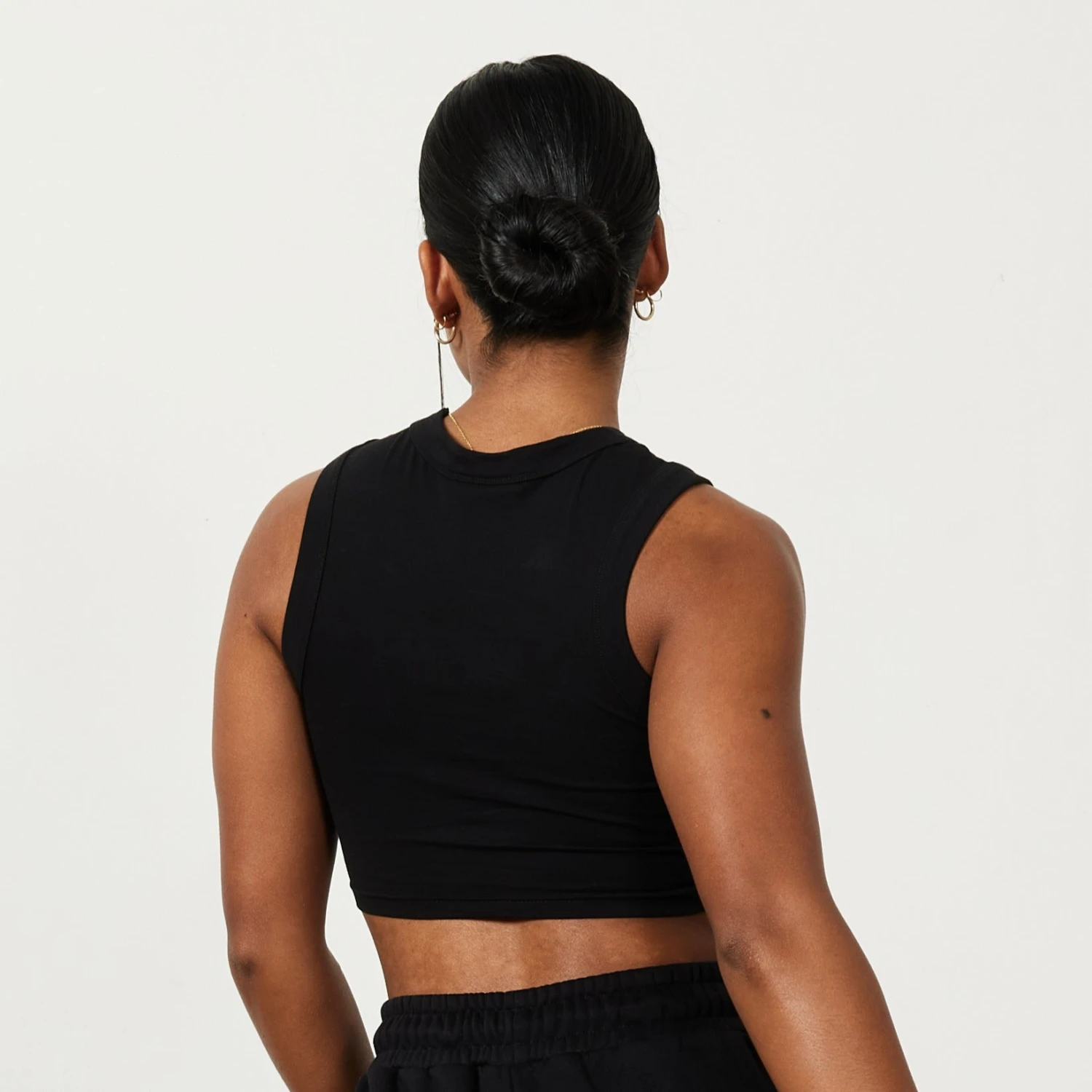 This soft cotton blend tank top is cropped in length in a slim fit, with a subtle racer back and cotton ribbing on the sleeve edge and collar, finished with minimal printing branding on the front chest.