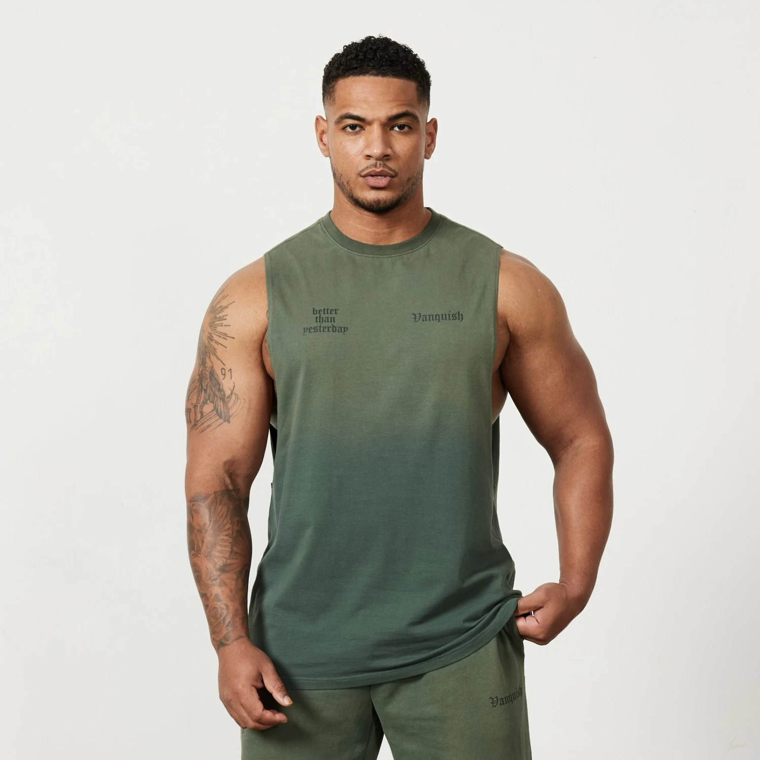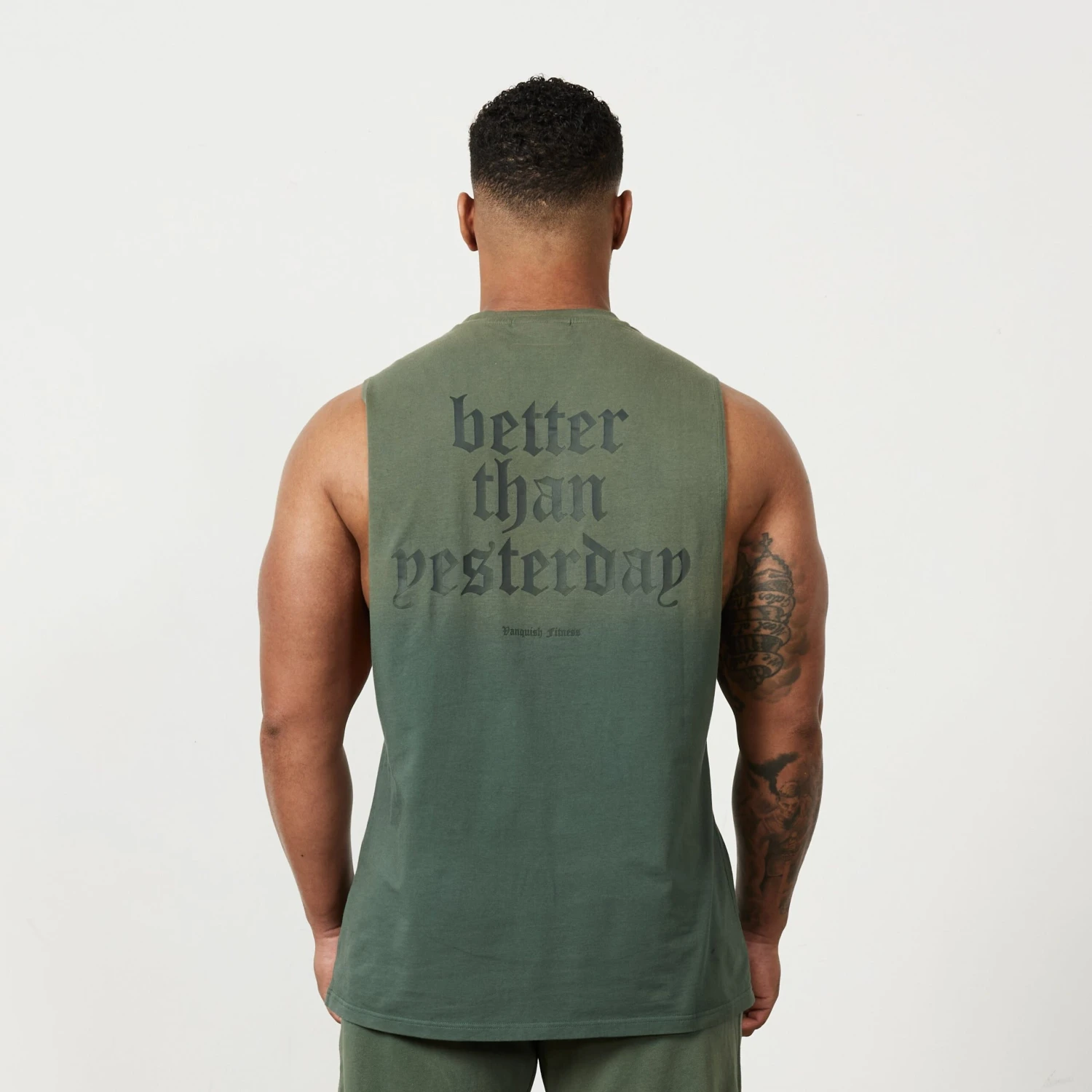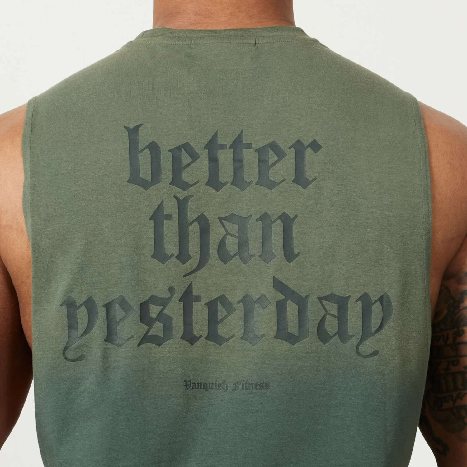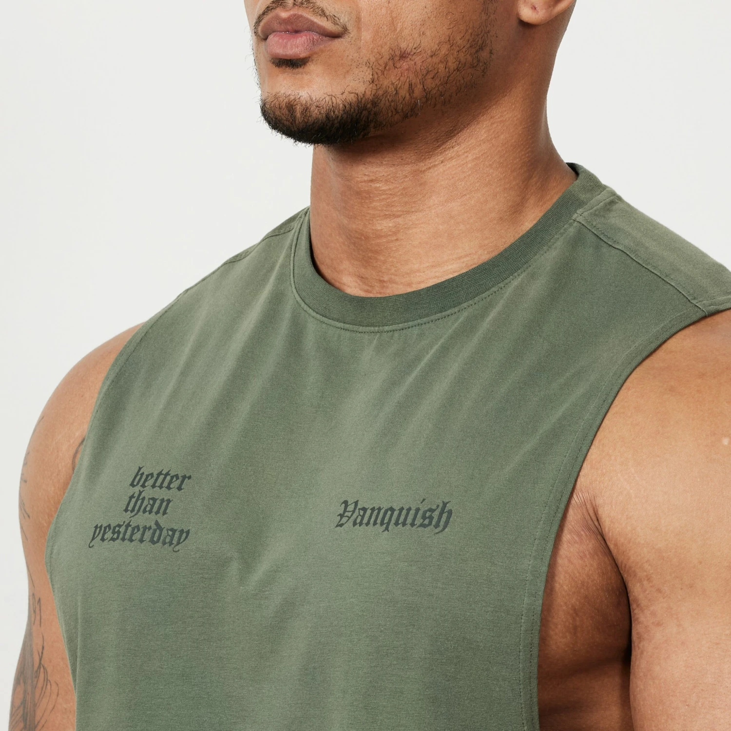 This sleeveless t-shirt is made from a soft cotton blend fabric with a deep ribbed collar, straight hem and forward shoulder seam. The back features a bold graphic style of branding with more minimal branding on the front.