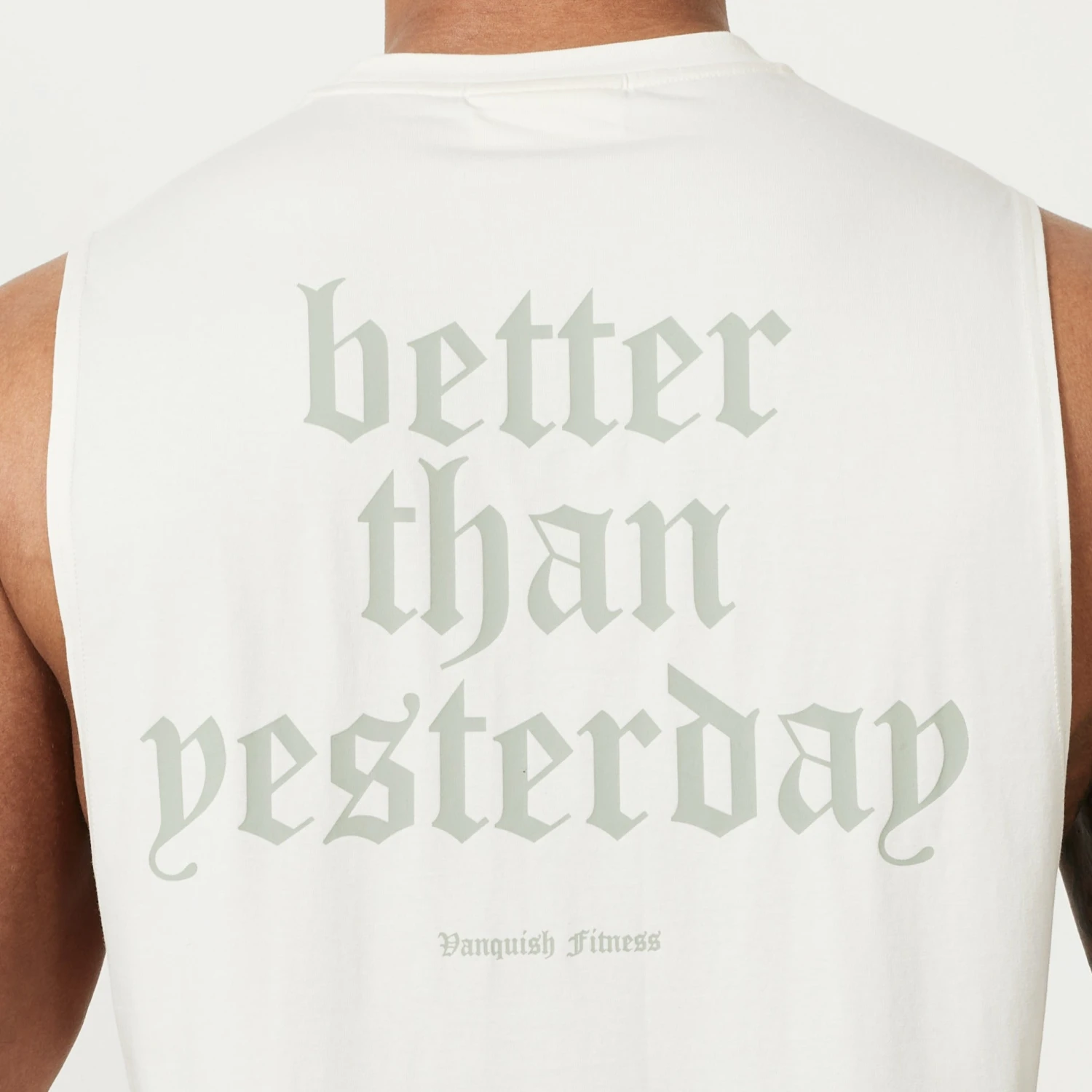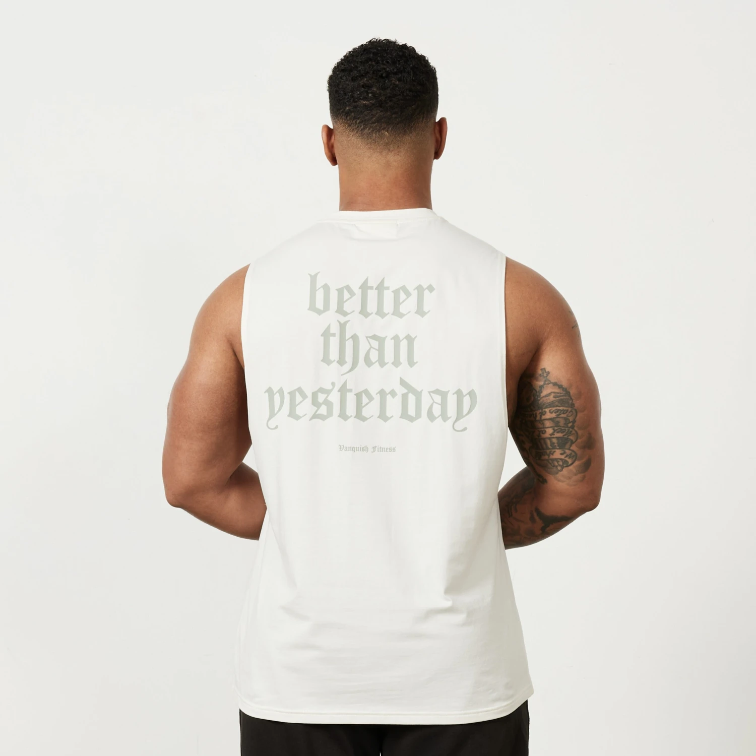 This sleeveless t-shirt is made from a soft cotton blend fabric with a deep ribbed collar, straight hem and forward shoulder seam. The back features a bold graphic style of branding with more minimal branding on the front.